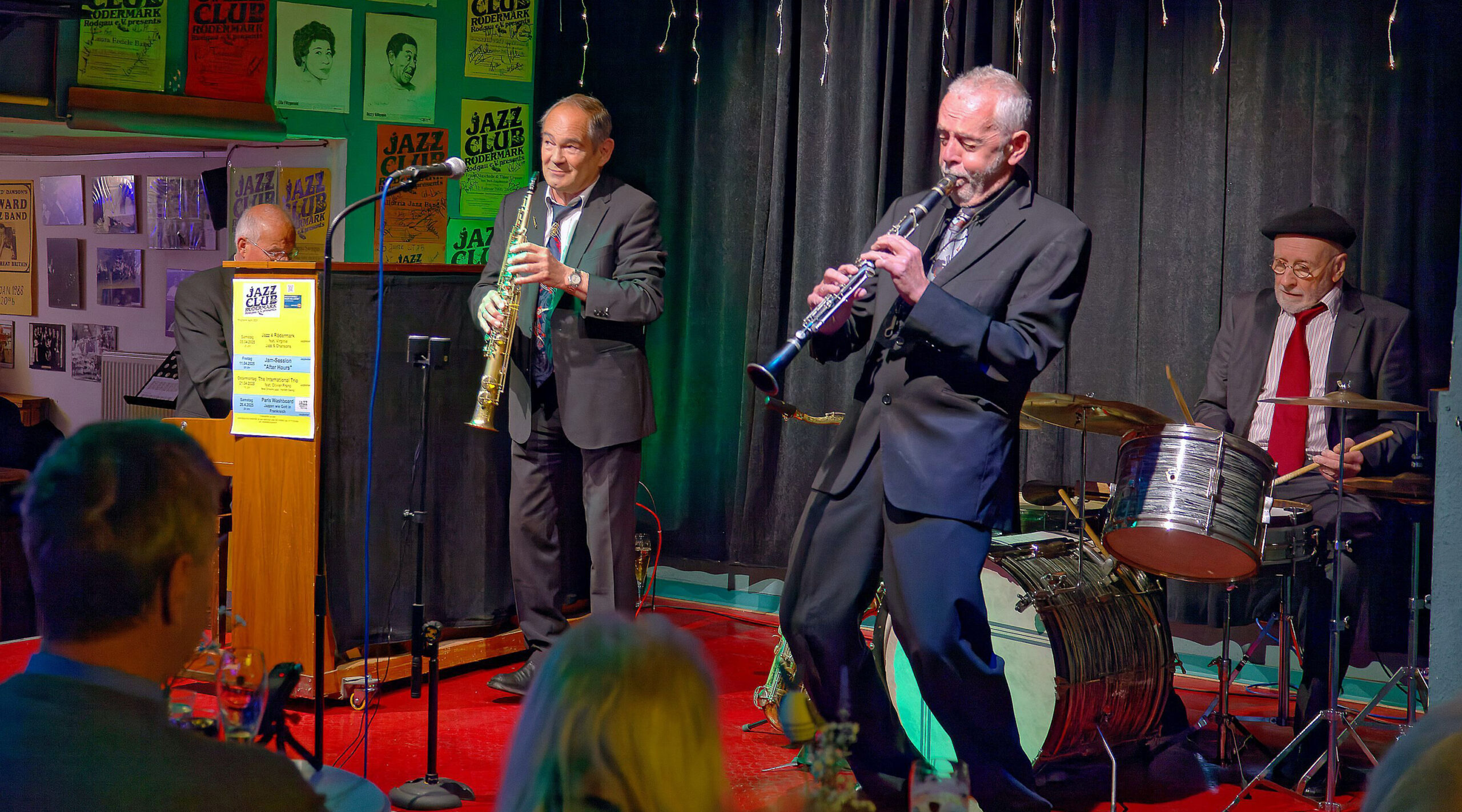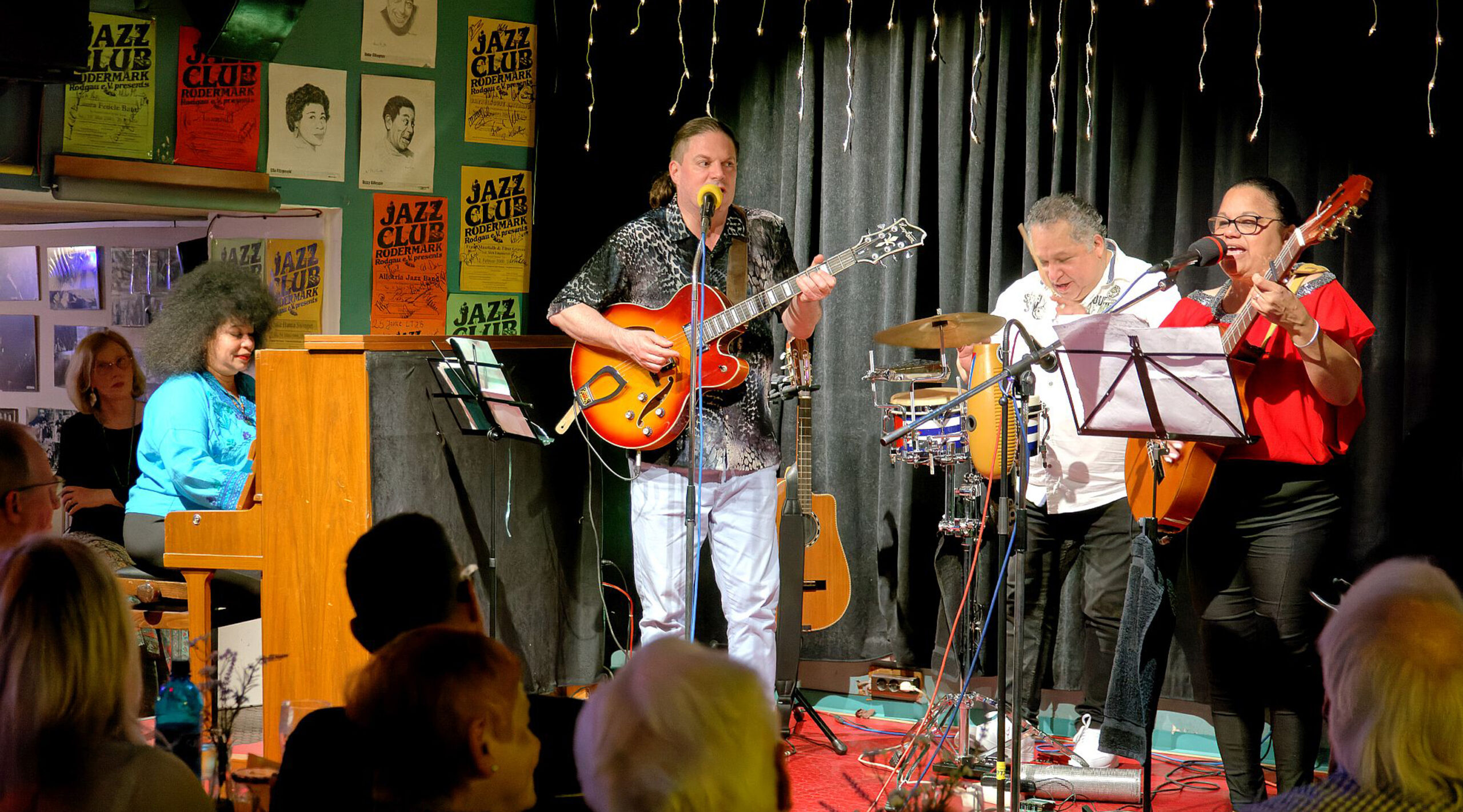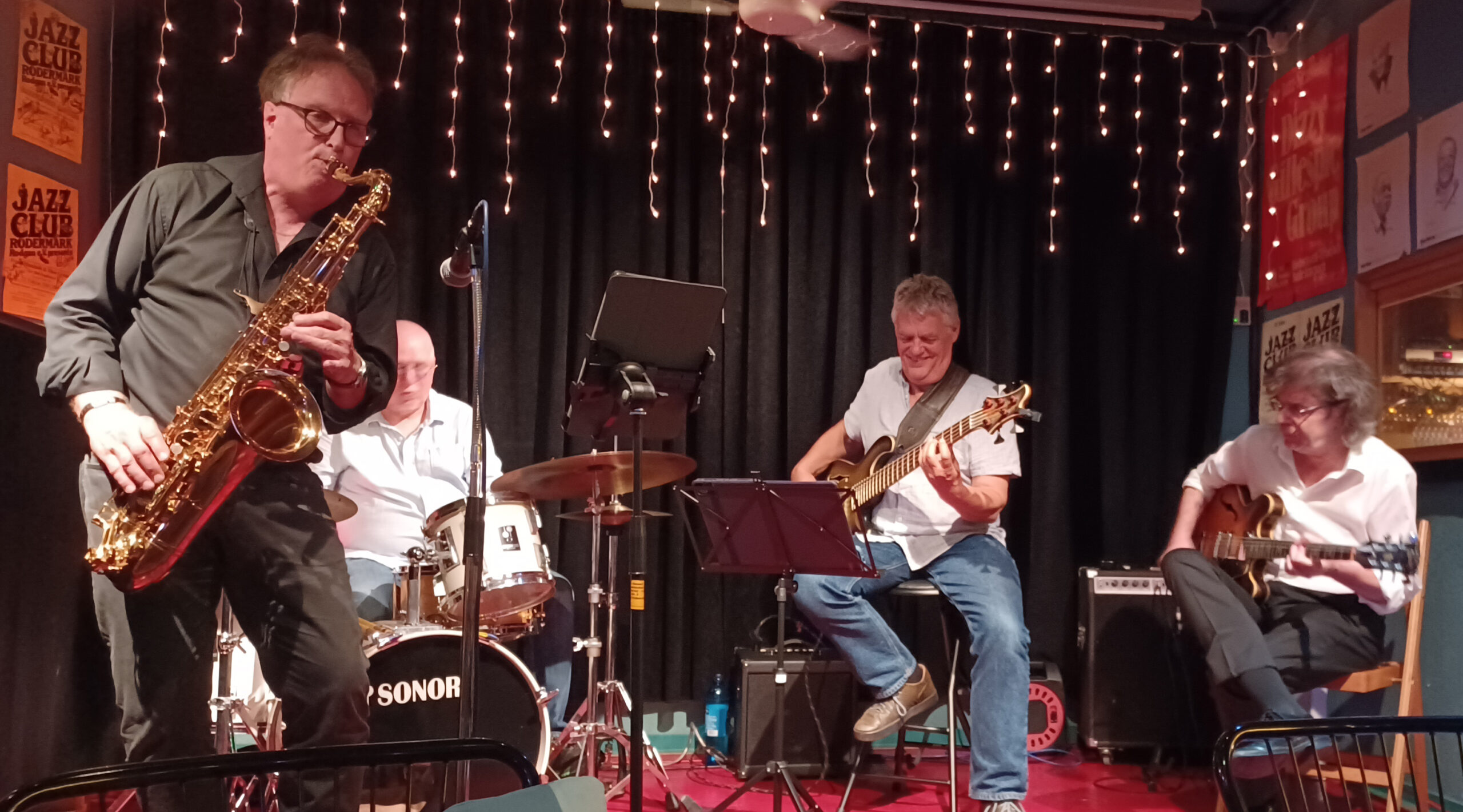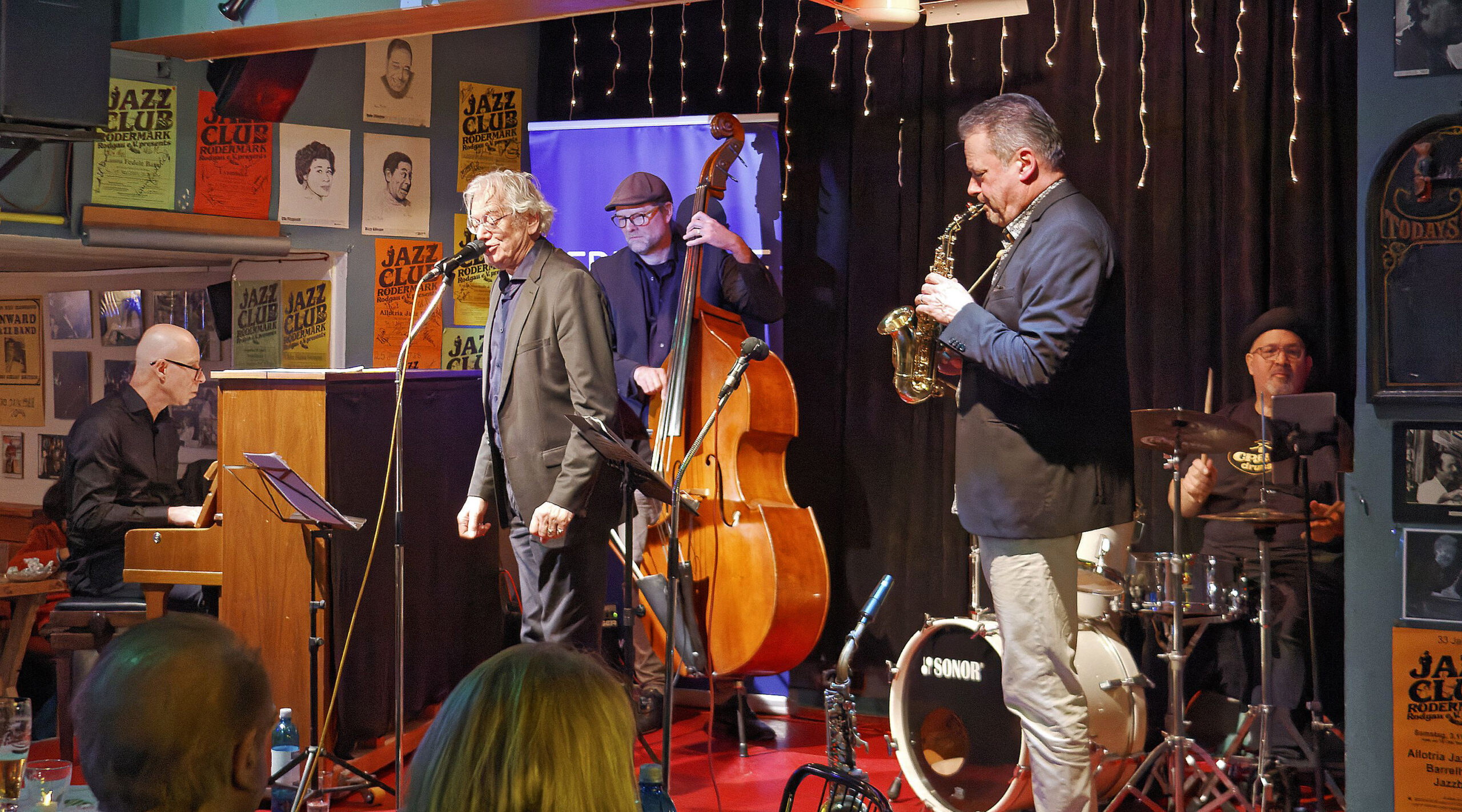 Der Jazzclub präsentierte das Berry Blue Quartett mit ihrem neuen Programm: „Swing Tanzen … Erlaubt!” Auch wenn das Tanzen der Zuhörer leider ausfallen musste, zogen die von Christoph Aupperle und Julian Keßler neu arrangierten Klassiker altbekannter Swing-Hits bis hin zu Stücken der Beatles die Zuhörer ungehindert in ihren Bann. Mit ihrem unverwechselbaren Sound und einem mitreißenden Programm spielten Hans Rück (as, ss), Siegfried „Berry Blue” Kesseler (voc, perc ) Christoph Aupperle (p) und Julian Keßler (g). An diesem Abend blieben die Füße, wenn auch unter den Tischen, in Bewegung. „Swing Tanzen” im Sitzen ist immer erlaubt.